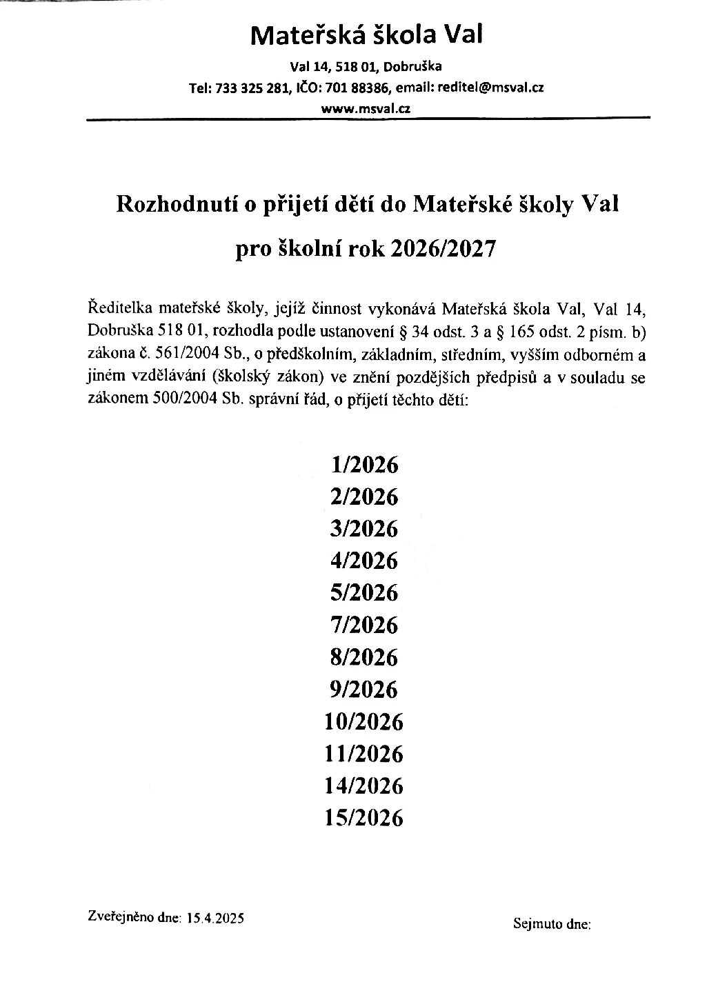 Rozhodnutí o přijetí pro školní rok 2026/2027